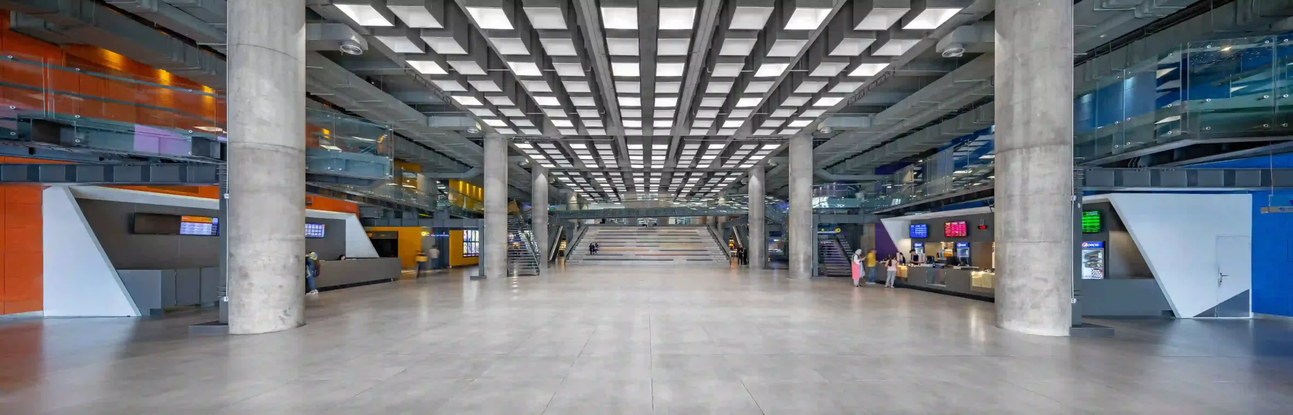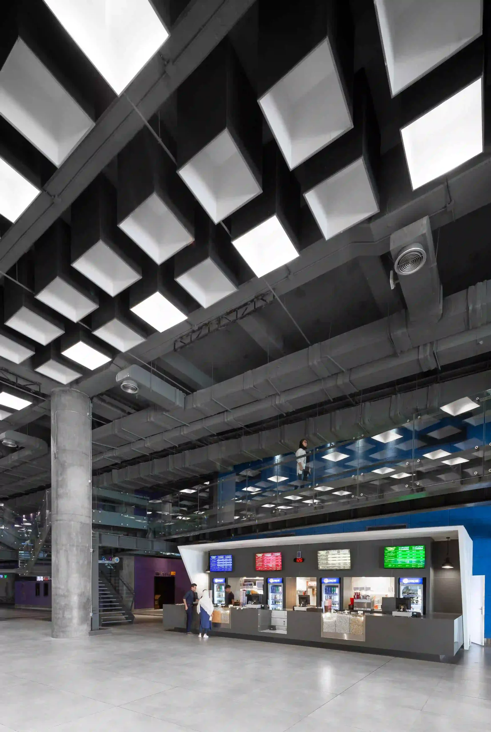The lobby is the connecting element of the halls serving as the focal point of the complex. It has the ability to play variety of roles, including concerts, artistic and cultural events. The multifunctionality of this large space has been enhanced by adding two elements which are a bridge and a communal seating.