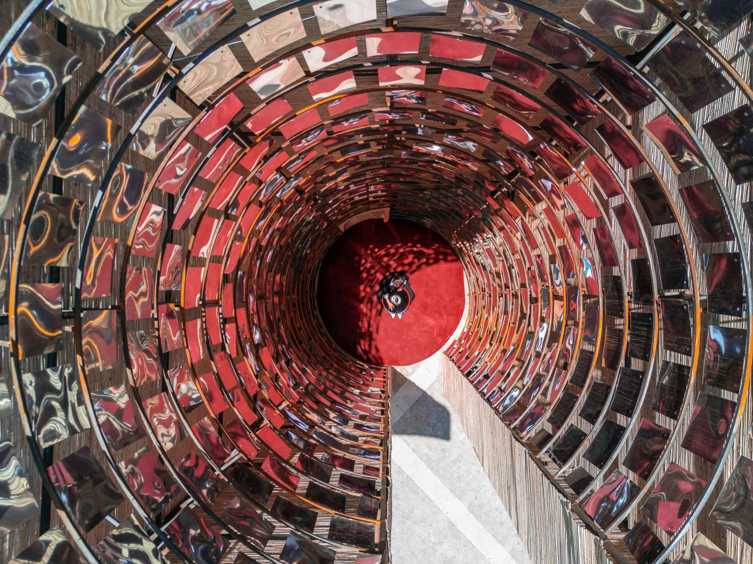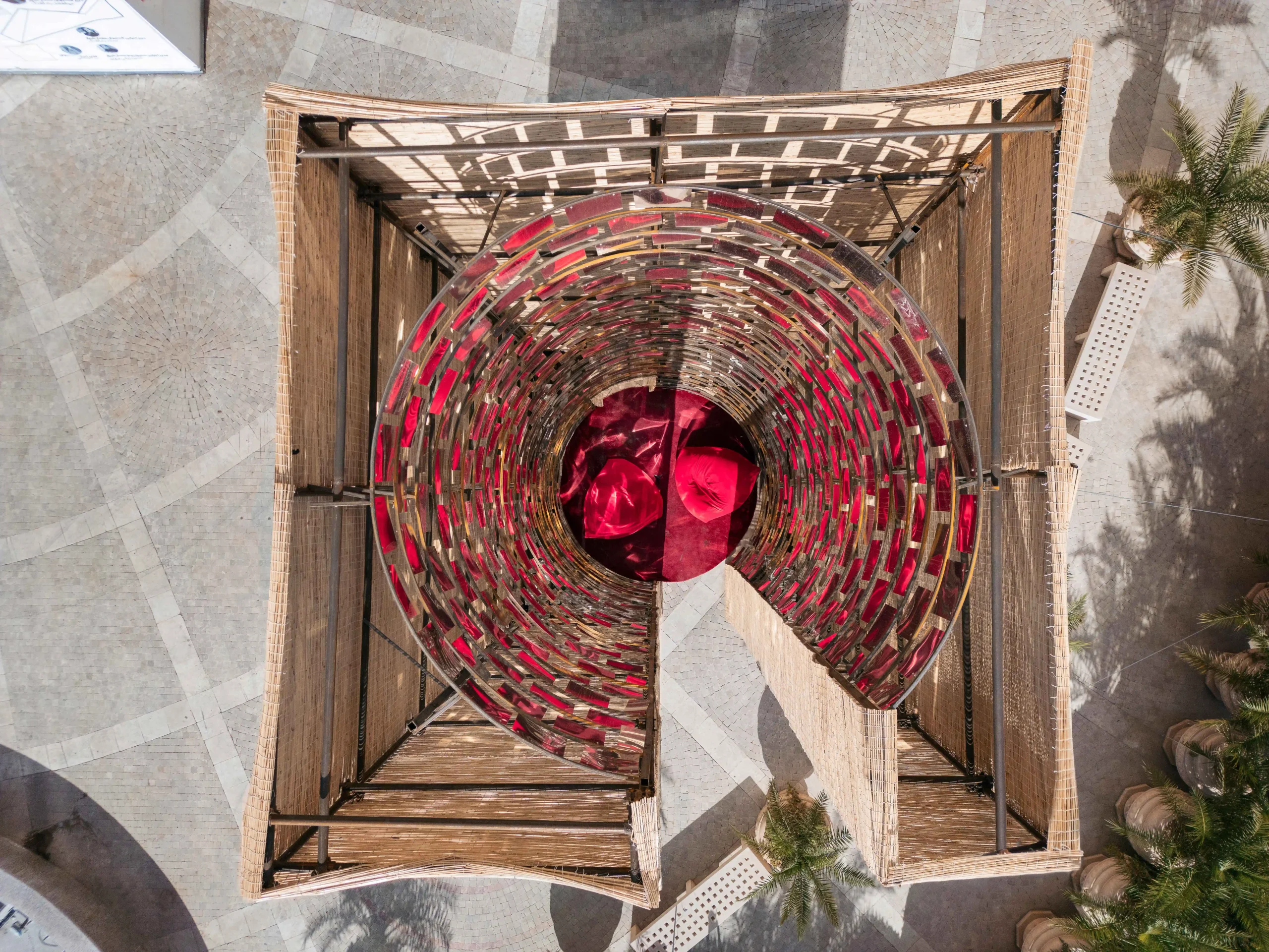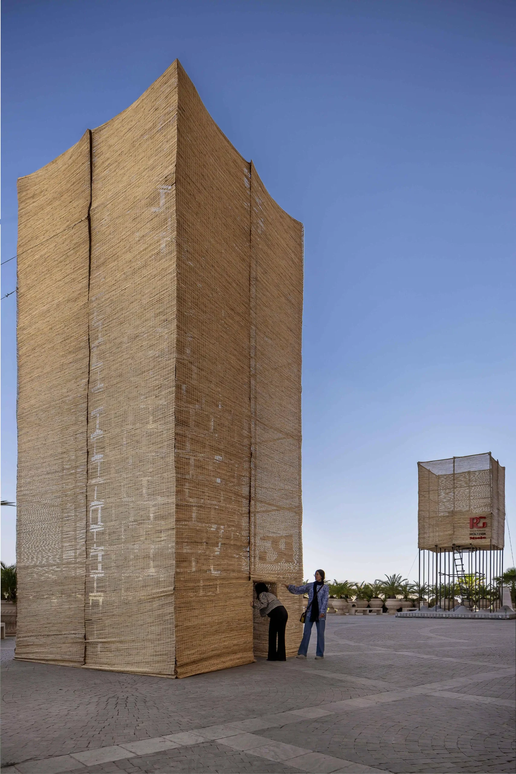 We reinterpreted familiar materials for unconventional roles: Tegeer (a traditional shading material) became the façade; concrete test cubes, normally discarded, formed the foundation; scaffolding served as the structural frame; and mirrors defined the interior surfaces. These elements transcended their standard uses, both aesthetically and functionally.